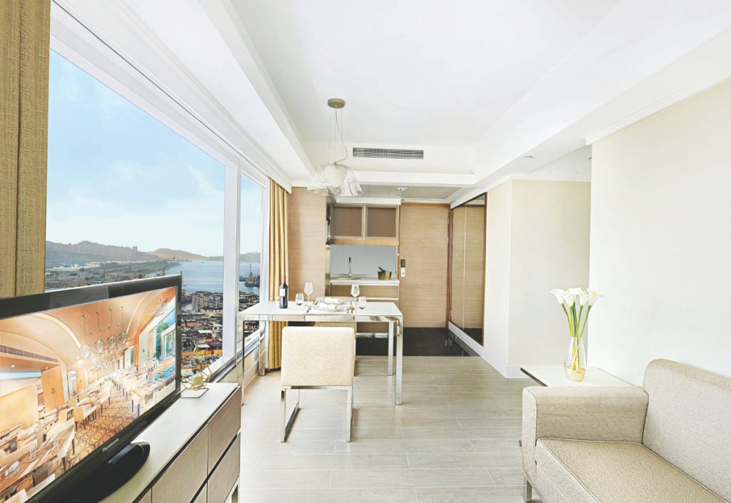 房间空间宽敞,设有一整面落地大玻璃窗,景观开扬,最多可供3人入主。酒店亦设有健身室。