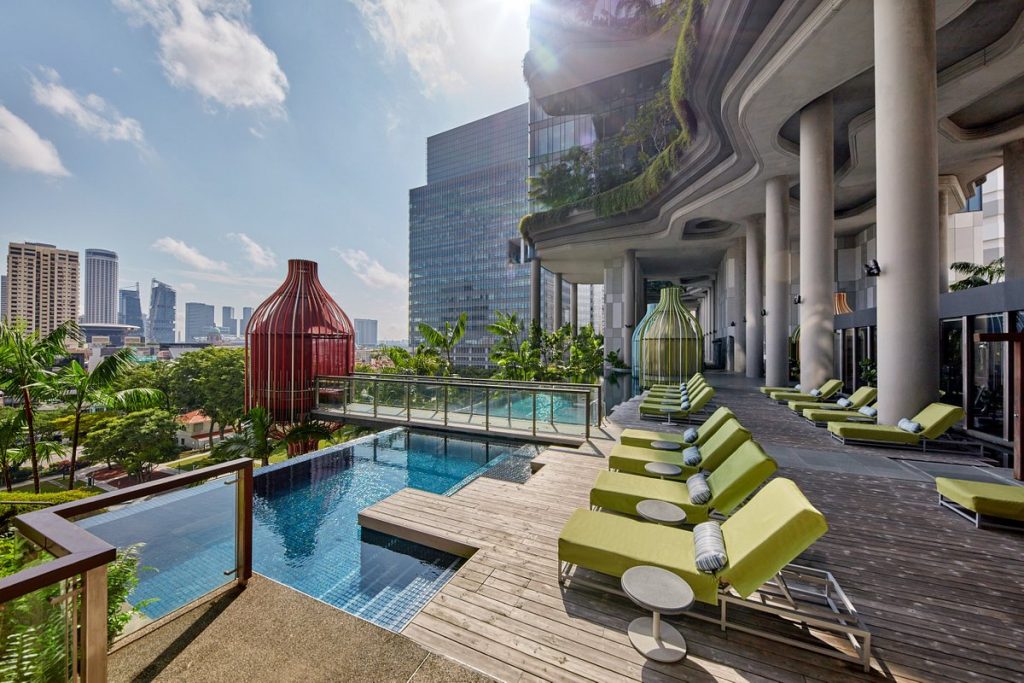 酒店由新加坡本土建筑事务所 WOHA 设计,属于新加坡的网红五星酒店了,拥有 15,000 平方米的空中花园,外墙被茂密植被包裹,种植着棕榈、灌木、藤蔓等植物,与芳林公园相应,从远处看仿如一家水族馆。