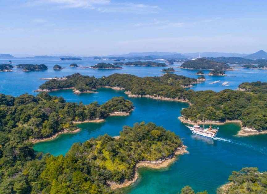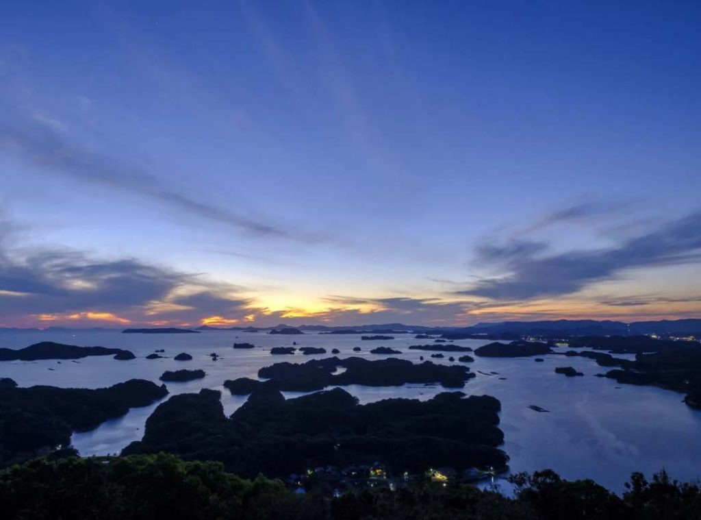 长崎佐世保港外全长25km的海上漂浮着无数小岛,这一景象被统称“九十九岛”,也是日本百景之一。岛屿的实际数量当然远远不止九十九个,最推荐乘坐游览船来欣赏这一海上绝景。如果赶上黄金周和暑假的日落巡游,就可以欣赏到漂浮在金光闪闪的海面上的群岛剪影,是另一种令人惊叹的盛大美景!