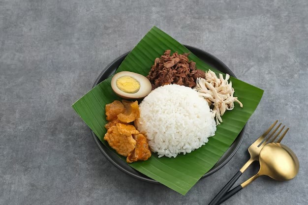 古德是日惹地区的特色美食,由未成熟的菠萝蜜在棕榈糖和椰奶中煮沸数小时而成。菠萝蜜的口感软糯而略带酸味,与棕榈糖的甜和椰奶的香完美融合,形成了一种独特的香甜浓郁口感。通常搭配鸡肉、熟鸡蛋、豆豉、豆腐、辣椒酱、脆牛肉皮等,令人难以忘怀。