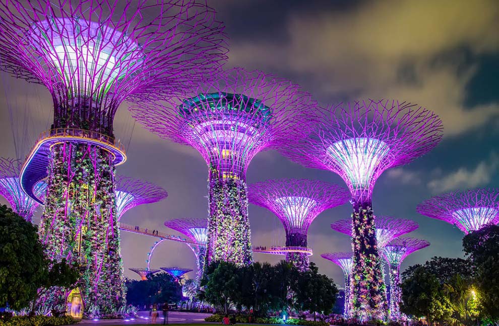新加坡滨海湾花园灯光秀是一项令人惊叹的视觉盛宴,位于新加坡滨海湾花园。这个活动是新加坡的新地标,曾经荣获2012年世界最佳建筑奖。灯光秀的焦点是“超级树”,这些巨大的人造树塔高达25到50米,拥有壮观的垂直花园。每当天色渐暗,超级树就会逐渐改变色彩,随着天空的变化而变幻,直到夜幕降临,超级树们被完全点亮。