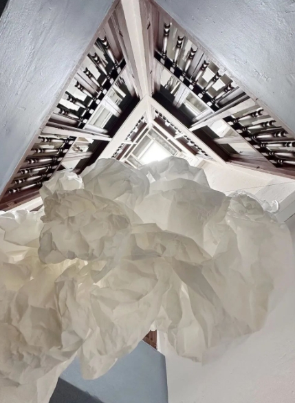 被一朵云吸引而来的CLOUD Cafe,在工业风粗旷的室内,一朵飘浮于半空中轻盈的云朵显得尤其浪漫。由各种纸张纹理手工制作的云朵让整个空间都变得空灵诗意起来。