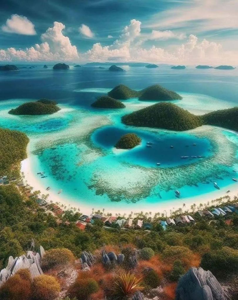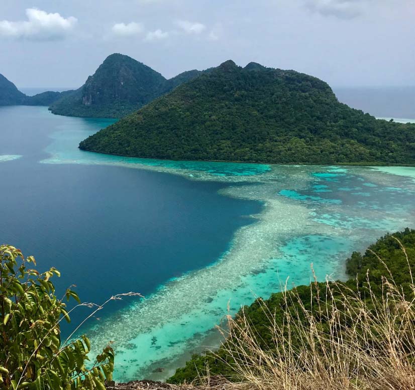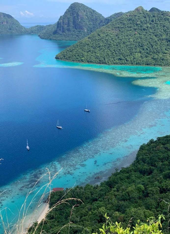 爬到珍珠岛的山顶,可以俯瞰整个岛屿周围的壮丽景色。从山顶眺望,你可以看到周围的珊瑚礁群和火山潟湖,以及远处不同颜色的海洋。这种迷人的景色让人仿佛置身于明信片中一般,无论哪个角度拍摄都是壮观的风景,成为整个仙本那地区最漂亮的地方之一。