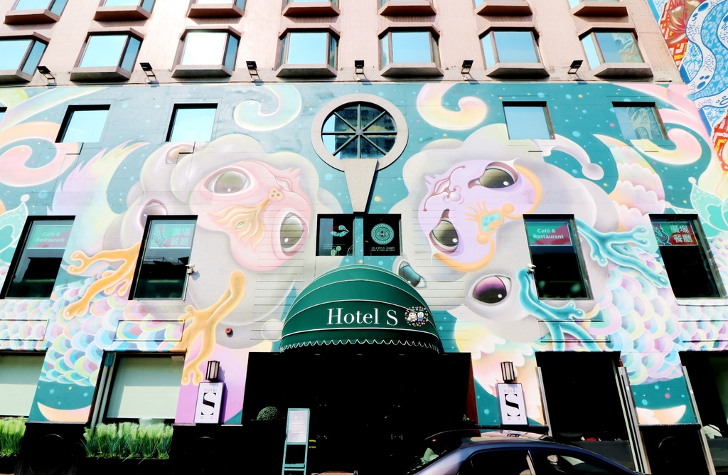艺术氛围:酒店的外墙有很多艺术涂鸦,每层楼都有很多海报图画,连每层楼的电梯都是不一样的艺术贴纸。