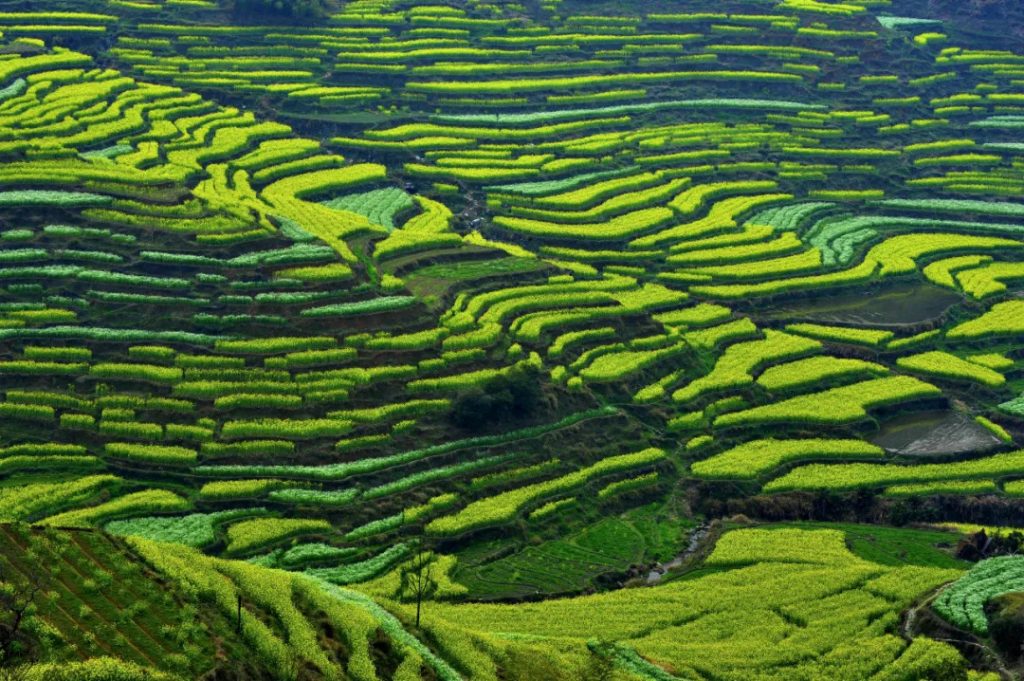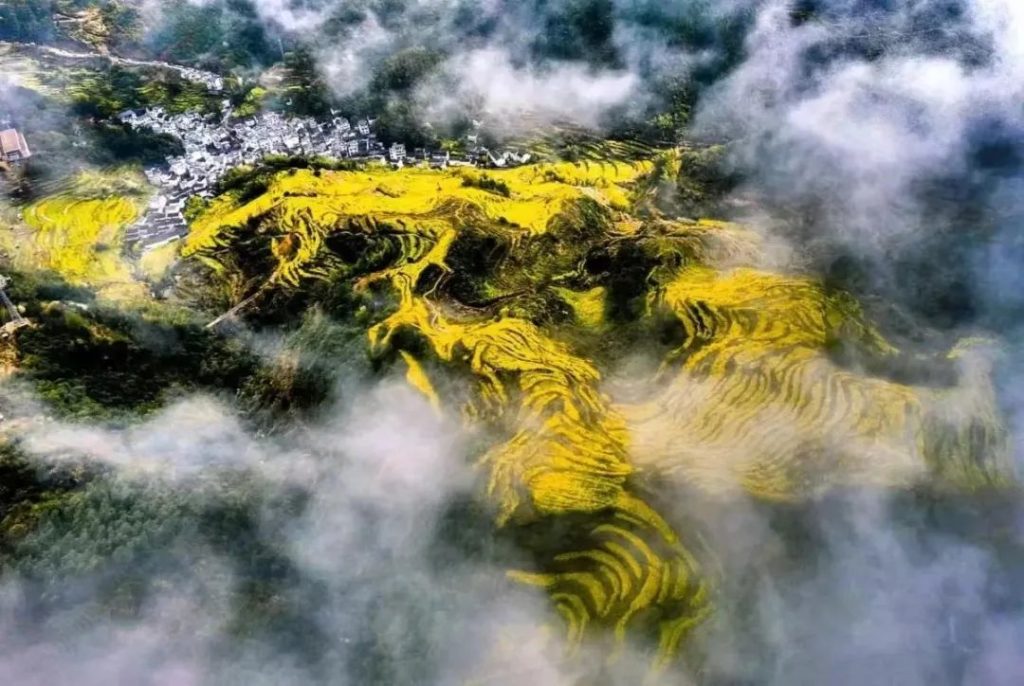 每年三月油菜花漫山遍野地开,篁岭就变成了金色的海洋,美得如梦似幻。“上帝的指纹”“全球十大最美梯田”,都是人们对梯田花海的赞叹
