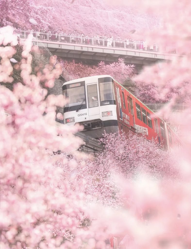 - 直接乘坐2号线到佛图关站,在列车内体验穿越粉红花海的场景。