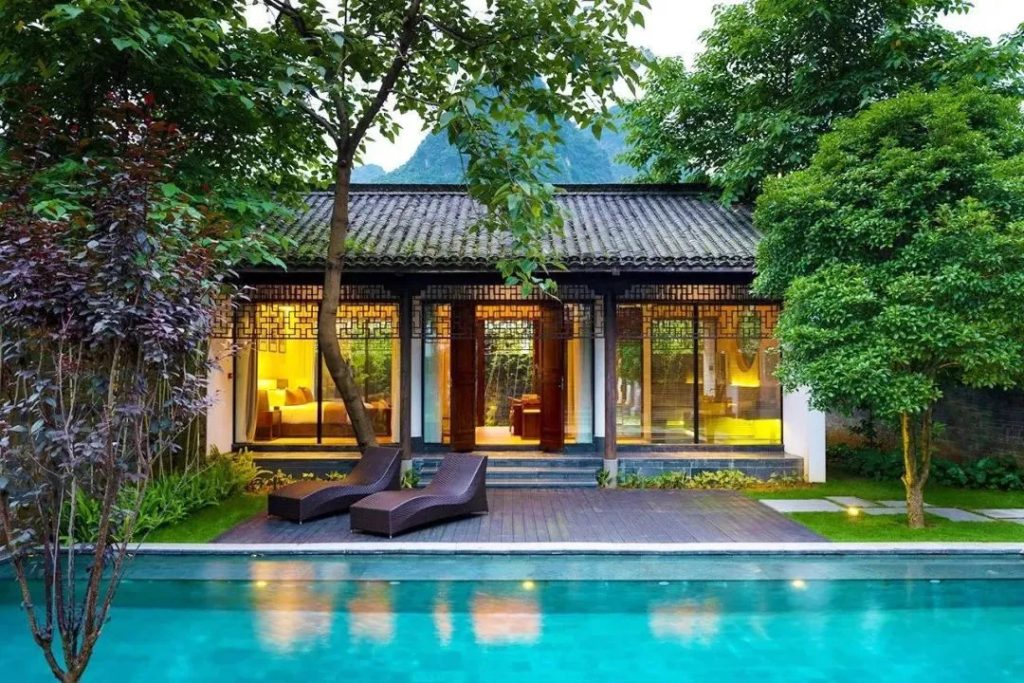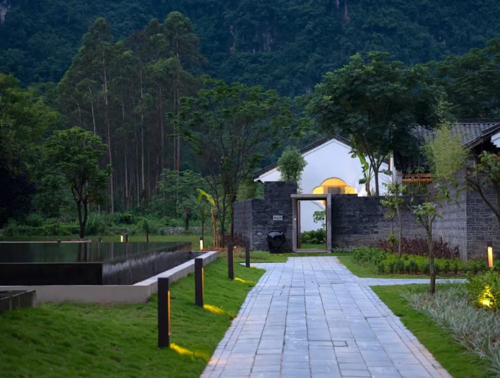设计师将巴厘岛风格与传统桂北民居完美结合,整个设计低调,简约,奢华的中式白墙灰瓦倒印在山水里,宛若天成。