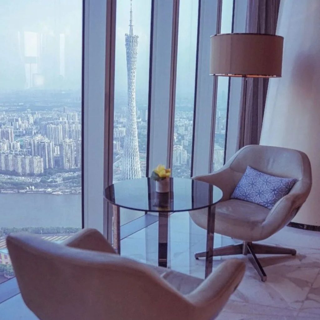 广州瑰丽酒店坐落于广州最高建筑——530米高108层的周大福金融中心顶端39层,大堂设在95楼,这是名副其实的空中大堂,而所有客房也都称得上是云端居所,拥有绝对优势的云端景致。