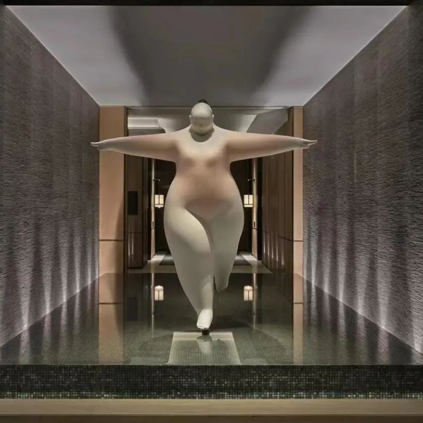 酒店入口处的朱砂漆大门、欢迎大堂的“花坛”艺术装置、95楼水池中轻盈的“胖子”、还有很多具有实验性的中国水墨画与书法艺术品,在瑰丽,可以自由探索。