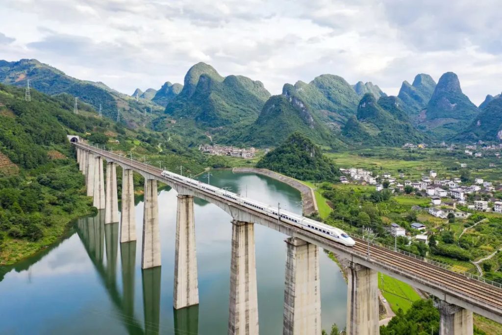 阳朔至广州方向,有一段线路将中国桂林山水的浪漫展现的淋漓尽致,喀斯特地貌在云层中若隐若现,田野上的房屋星罗棋布, 这样一段列车画面也被网友称作“中国最美山水列车。”