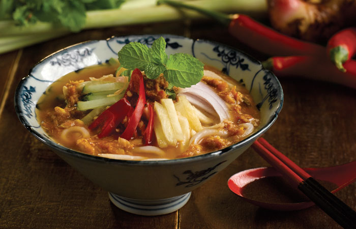 这是一碗让人流连忘返的椰浆面。酸辣鲜香,汤底浓郁,是华人和马来人文化交融的产物。做法讲究,先用虾壳、香料和椰浆熬汤,再配米粉、豆腐泡、鸡蛋、虾仁,最后撒上薄荷叶,香得不得了。