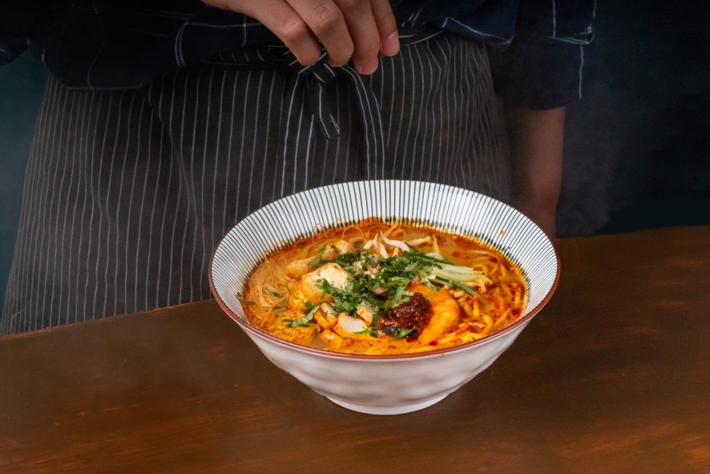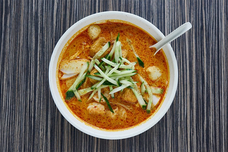 和娘惹叻沙不同,它更偏向印度风味。椰浆加上咖喱粉,汤底香浓厚重,一口就能暖胃。通常搭配油面或米粉,再放豆腐卜、鱼饼、鸡丝,喝完汤还想再来一碗。