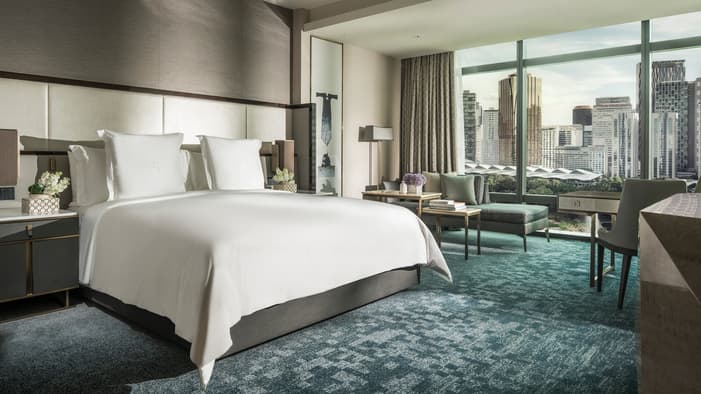 酒店共有208间客房,63㎡起跳的基础房间面积,在整个吉隆坡都算是数一数二的!通过房间的落地窗,可欣赏花园湖和吉隆坡天际线的独特景色。相对于其他当地酒店而言,瑞吉酒店的餐饮配备偏向于国际化,配备了咖啡馆,法餐,美餐以及亚洲餐饮的餐厅。
