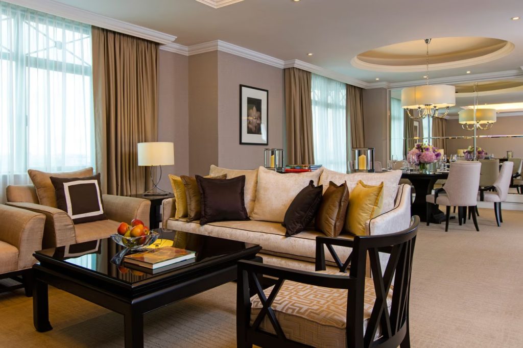 酒店还设有五间餐厅和酒吧,标志性的全日制餐厅Kwee Zeen供应泛亚洲特色美食,中餐厅Wan Chun Ting取名源自中文的万春亭,供应地道的粤菜和皇家美食,以精致的织物、刺绣品和金色锦缎丝绒映衬生辉。中餐厅设有四间陈设奢华的私人包间,餐厅巧妙运用中式元素和传统艺术品,呈现出精致考究的东西方融合装饰风格。