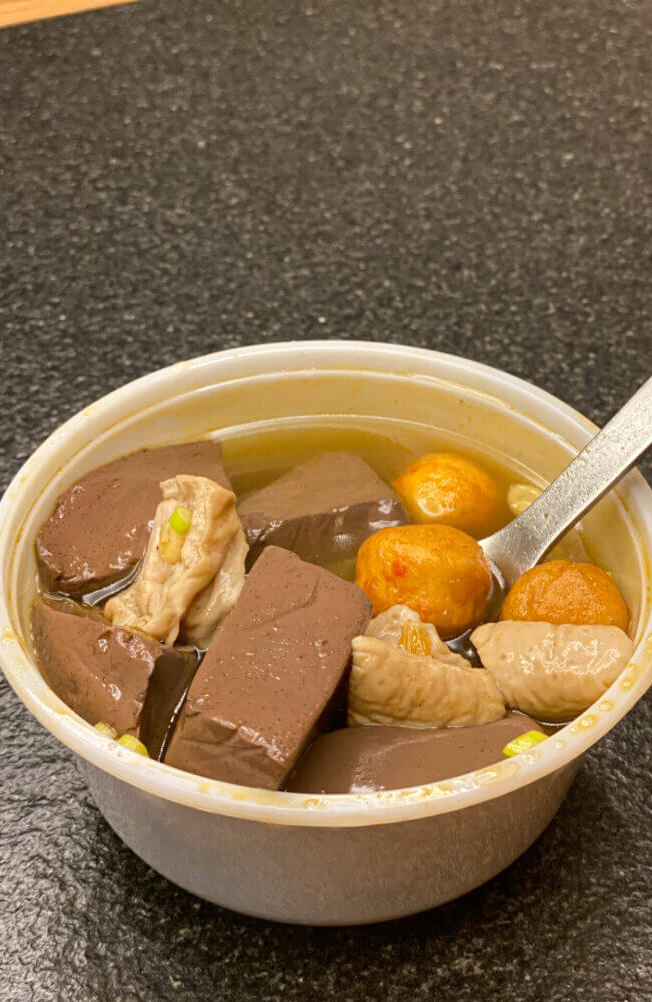 喜欢吃鸭血的朋友到花园夜市就来吃陈大民麻辣鸭血吧!他们家的汤头不太油,是可以喝下去的程度,略带些微的辣度很爽口,不敢吃辣的人也有原味可以选,鸭血吃起来滑嫩嫩的、鱼蛋也很Q弹,是个鸭血控跟鱼蛋控的必吃小吃!
