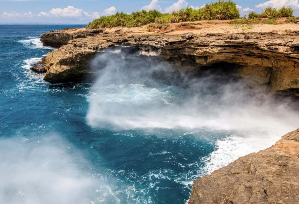 蓝梦岛另有一个著名景点——恶魔的眼泪。海浪的冲刷历经岁月,形成了这一独特地貌。在阳光照耀下,海水在坑内呈现出迥异的蓝色,仿佛恶魔落下的眼泪,涨潮时,巨浪汹涌,壮观非凡,令人叹为观止。