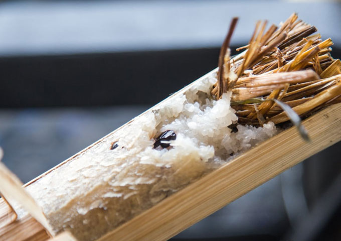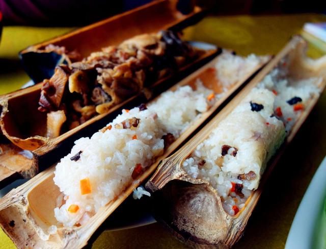 糯米、椰奶、红豆混合,填进竹筒里用炭火慢烤,烤出的竹香渗入糯米中,掰开竹筒的一瞬间,甜甜的香气扑鼻而来,软糯香甜,简直是人间小确幸!