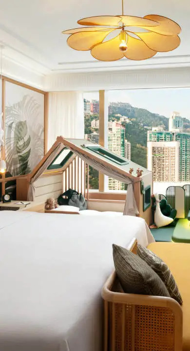 家庭楼层拥有21间充满奇思妙想的主题套房和客房,10个不同主题,媲美亲子室内乐园。从树屋、飞艇到童话世界中的神奇马车,将舒适的居住氛围和沉浸式的儿童互动体验完美融合。房间均能饱览太平山顶或维港景观,并提供额外行李储存空间、配有滑梯的安全床、互动玩具以及体现香港文化特色的装饰品。