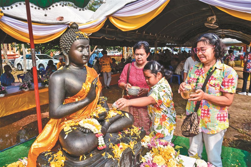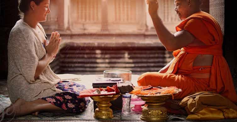 - 千年吴哥窟背景下浴佛祈福——用鲜花和清水为佛像沐浴,寓意洗去晦气、迎接好运。