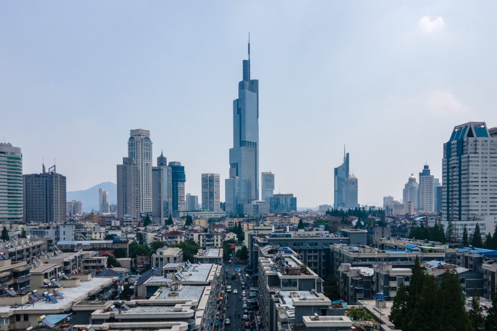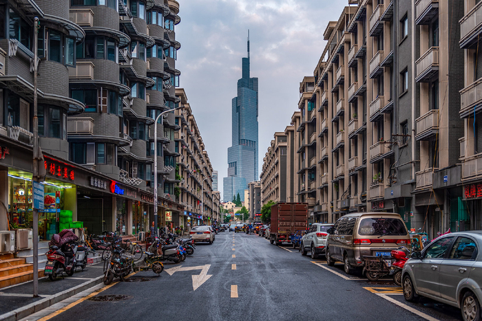 拍摄紫峰大厦。站在宁海中学北门附近的三岔路口,镜头里是市井烟火的老街,背景却是摩天大楼,形成的“赛博朋克”视觉冲击。