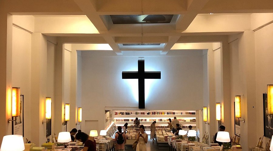 算是南京的文化地标,被誉为“中国最美书店”。它由地下车库改造而成,斜坡尽头的十字架是其标志性符号。