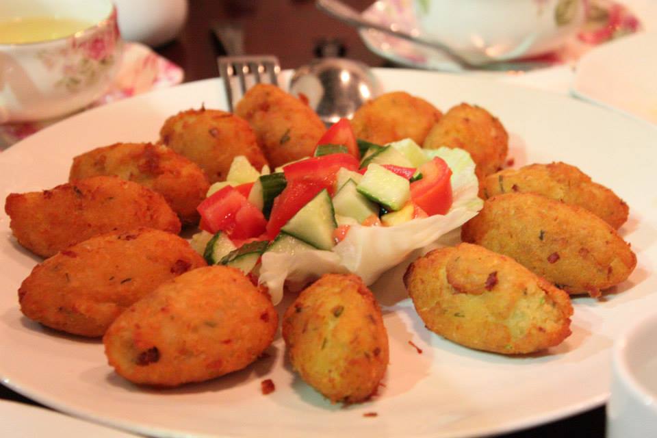 真不骗你,马介休球这道菜我是第一次吃,结果直接爱上了!马介休就是葡萄牙咸鳕鱼,把它剁碎加入土豆泥和欧芹,团成球,外面裹面包糠炸成金黄色。外脆里嫩,咸香带点鱼的鲜味,绝了!店家说这是地道葡萄牙家庭菜,不是那种给游客改良过的版本。