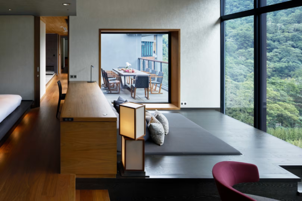 75㎡起跳的客房,在空间上相当阔绰。设计风格,也以现代简约风格为主,并注入了星野一贯的日式禅意元素。