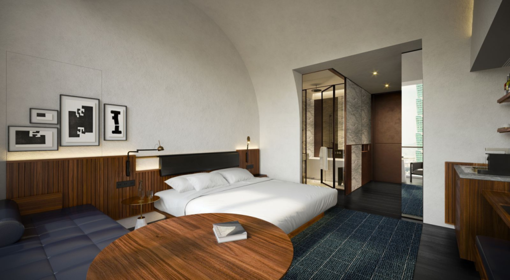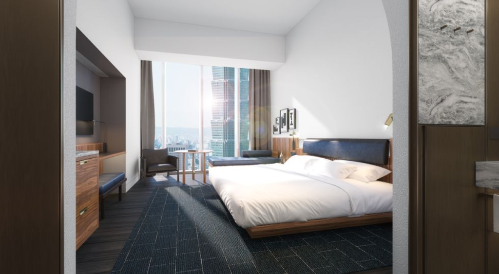 酒店拥有约260间房间,皆使用视野开阔的落地窗,让住客能欣赏到城市景观与自然风光。顶楼还会打造天际空间,将台北景色尽收眼底。