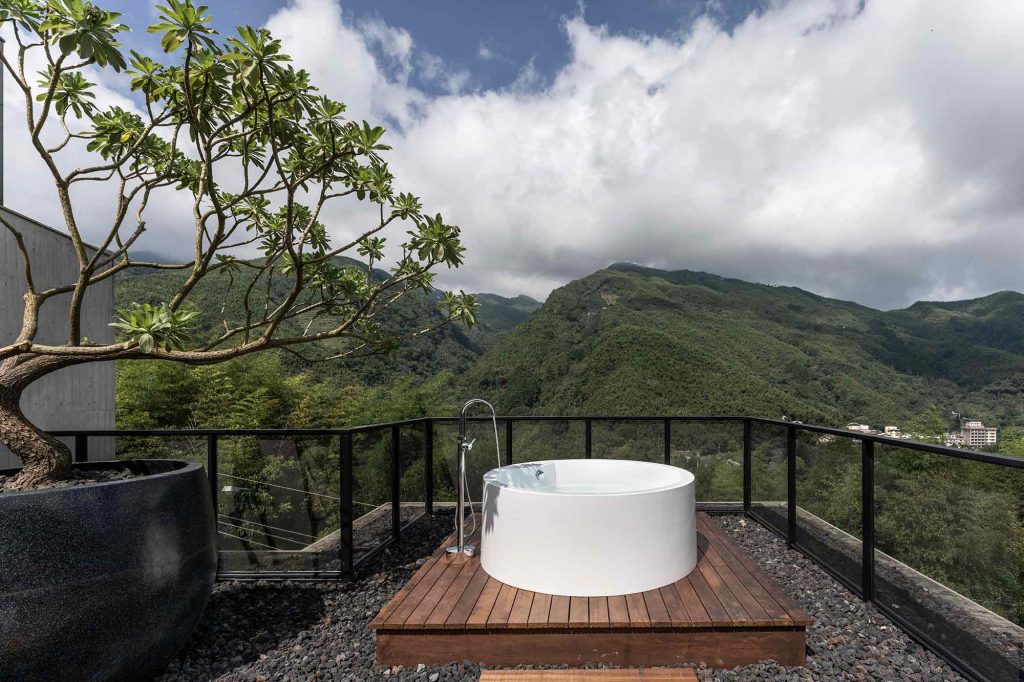 复式结构的房型,在二楼的部分则是有着24小时流动温泉,在房间内即可尽享一边观赏漫山绿意一边泡着私汤的乐趣。
