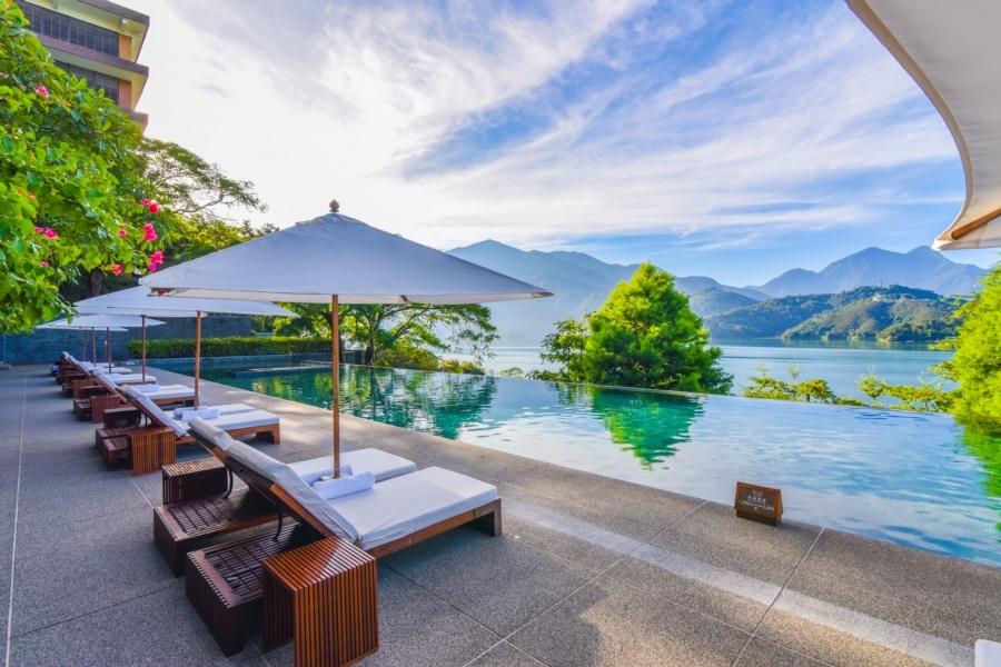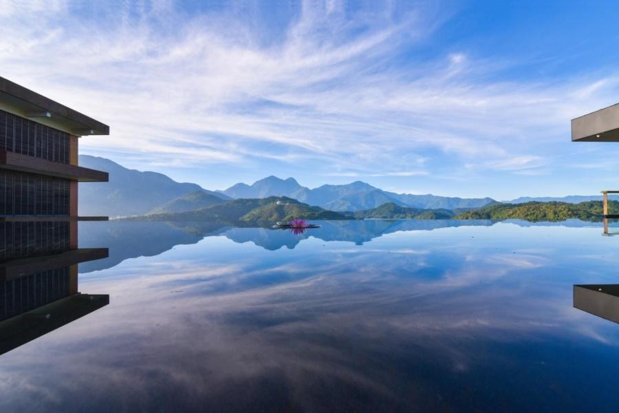 酒店的无边泳池最值得一去,透过平静的水面,仿佛与日月潭的秀丽风光融为一体。