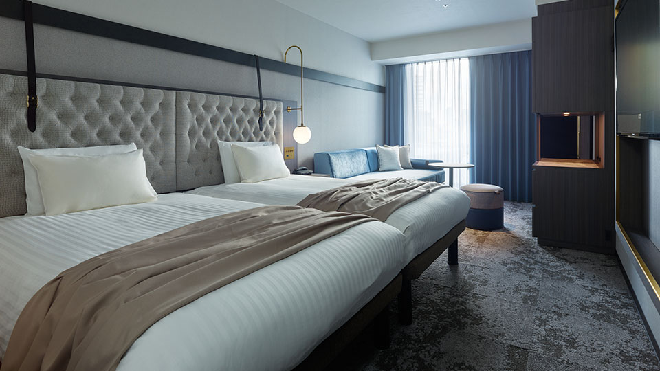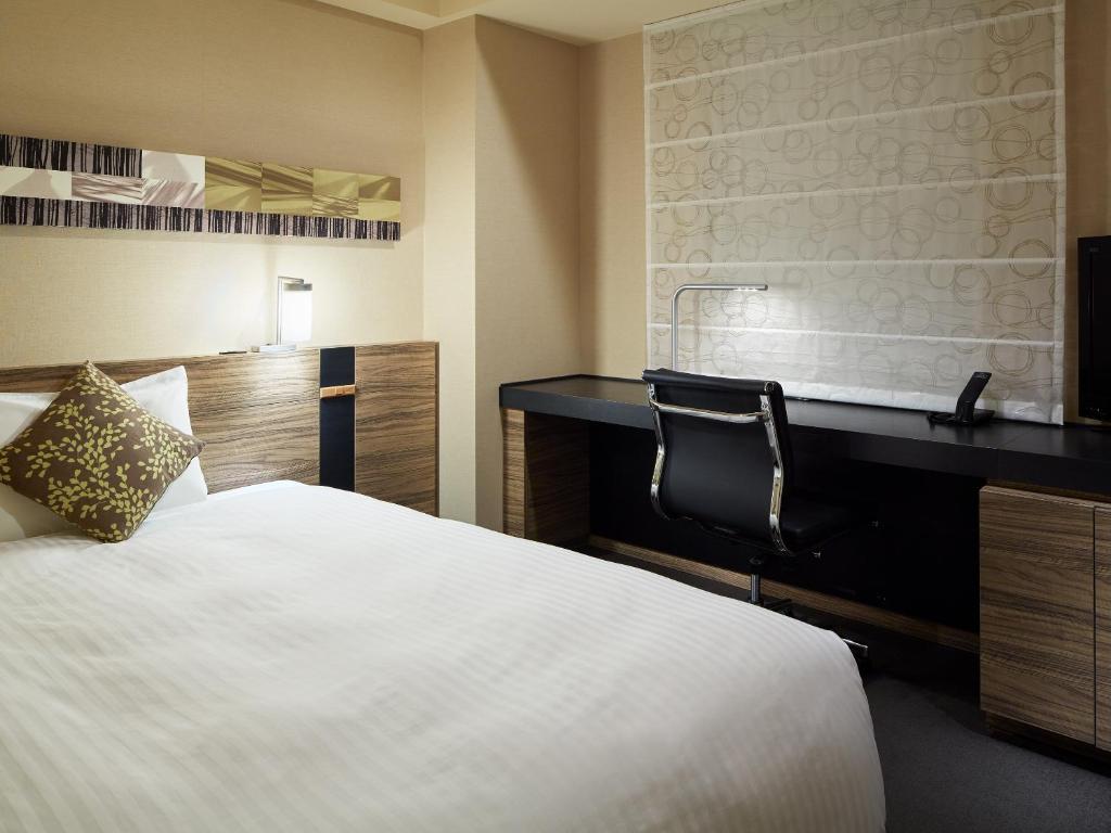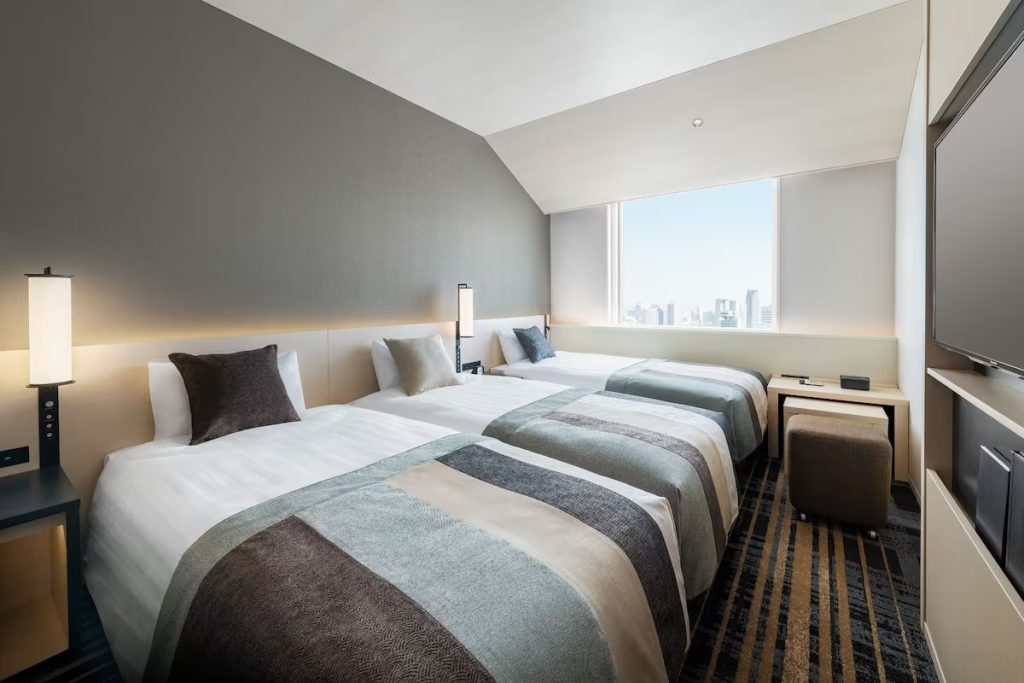 酒店距离车站700米左右,靠近大阪城公园和天满宫,现代风格酒店共有四款房型,双人床房20m²标配浴缸。