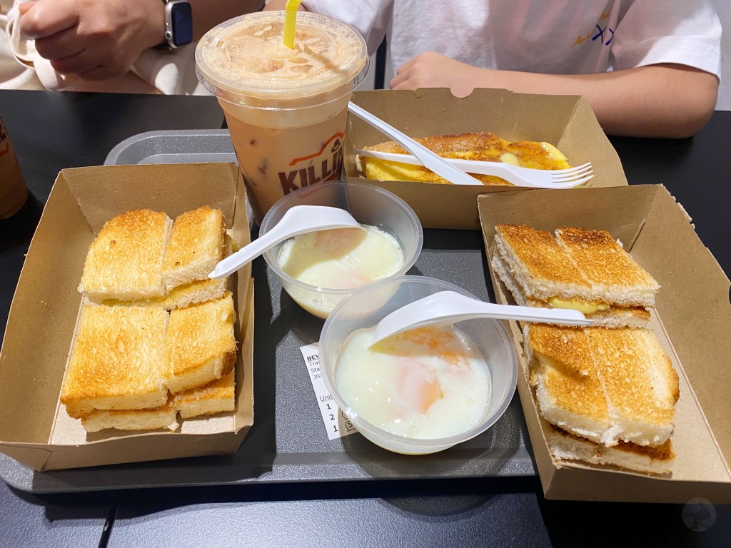 咖椰吐司套餐(Set A):包含咖椰吐司、生鸡蛋以及饮品(推荐换成咖啡豆浆),咖椰吐司又脆又香,吐司里黄油甜而不腻,按照独特吃法将酱油和胡椒粉加入生鸡蛋中,用面包蘸着吃,再搭配上咖啡豆浆,别有一番风味。