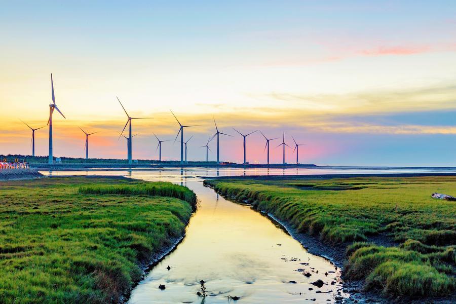 这里是风的画布,夕阳的调色盘。木栈道延伸向海天交界,退潮时湿地如镜,倒映着转动的白色风车,美得像一首诗。
