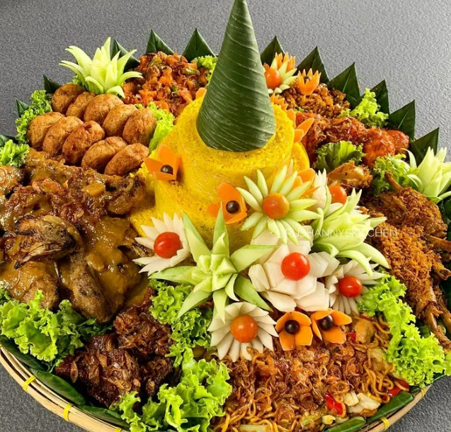堆成小山一般的椰浆饭,是印尼爪哇岛、巴厘岛和马都拉岛庆祝重要节日的传统菜肴。爪哇岛火山密布,人们尊崇山为先人的住所,象征着祖先的精神,因此将米饭堆成圣山的形状,借以表示感恩。椰浆饭的周围可以放上肉类、蔬菜、海鲜等配菜,根据爪哇当地的传统,这些配菜必须保持一定的平衡。