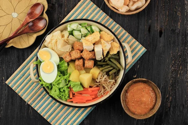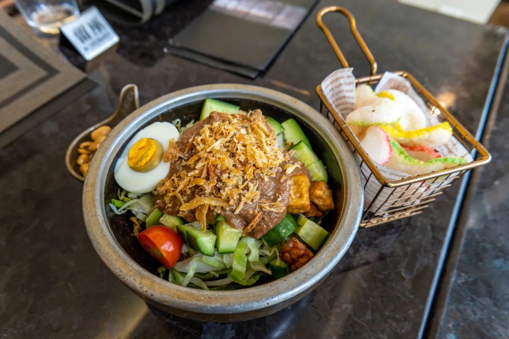 加多加多的意思是混合搭配,这是一种印尼特色的色拉,其起源有本土、受中国影响、受葡萄牙影响等说法。这道菜一般是用烫过的蔬菜加上鸡蛋、豆腐、天贝等,拌上调味的花生酱制成的,可以加入炸葱或者炸虾片丰富口感。