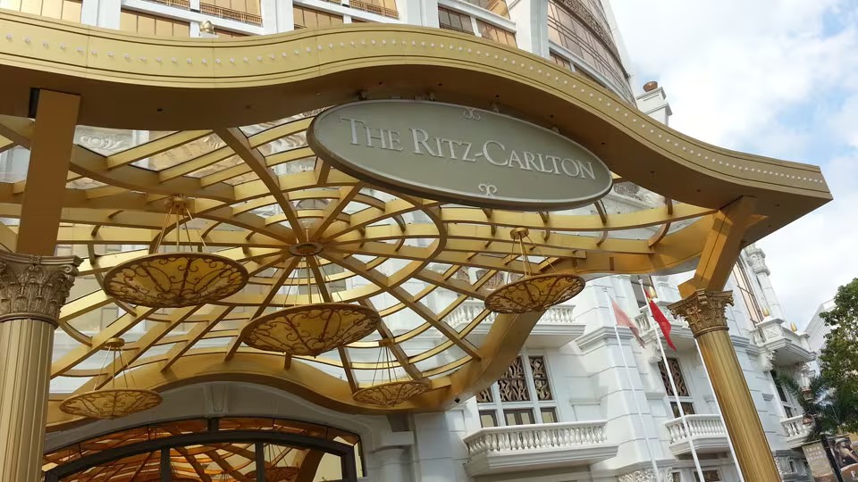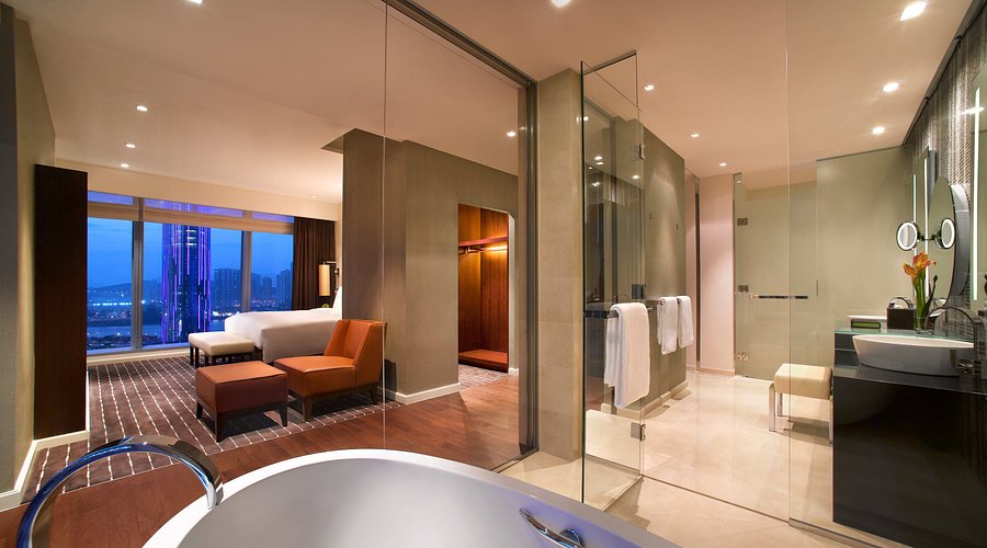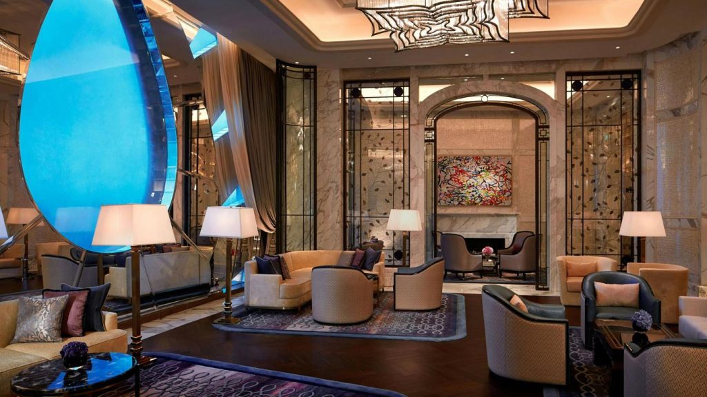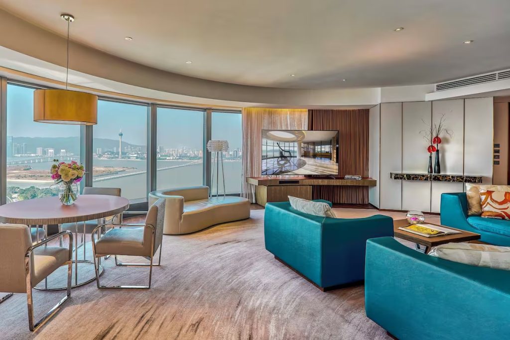 澳门丽思卡尔顿酒店位于澳门银河综合度假城内,所有房间均为套房,面积宽敞,浴室采用大理石装饰,配有圆形浴缸和电视。公共区域如大堂和电梯间也装饰有精美的水晶吊灯。