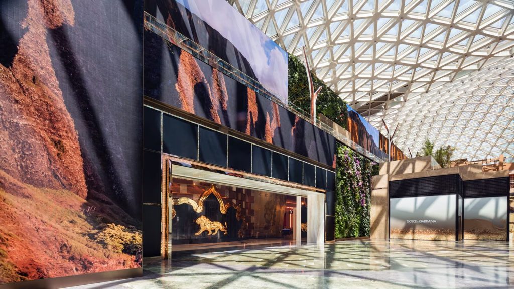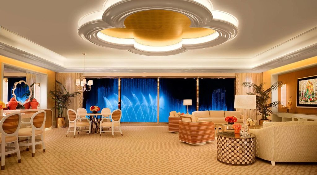 建筑特色:整个大楼向两边延伸,菱形的缆车环抱着中间的水池。室内有夸张的色彩搭配,大量使用大红色和金色元素,加上大面积镜面天花板和高密度放置的艺术品,更显穷奢极欲。