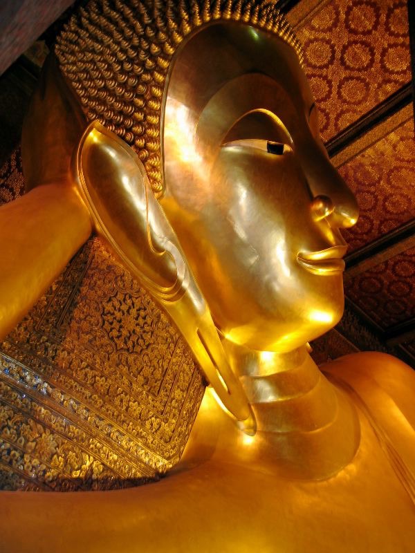 卧佛寺 泰国国内规模最大也最古老的佛寺。这座佛寺建于1832年。由泰皇拉玛一世所督造的,寺中供着一座斜卧金身大佛。佛身长46公尺、高度为15公尺,鞋底则为真珠母所镶嵌,庄严壮丽。「卧佛寺」也是研究草乐及泰式按摩的中心,寺后方有一间传统医药学院及一间按摩房,可以在这里享受专业的按摩服务,费用1小时250铢(须排队),1小时300铢(加草药),1.5小时500铢(不用排队),或缴费学习按摩的课程。