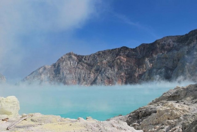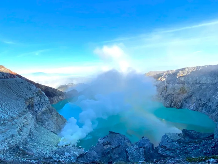 地处东爪哇深夜徒步2小时只为探索火山口的蓝火奇观火山湖的硫磺烟雾中。