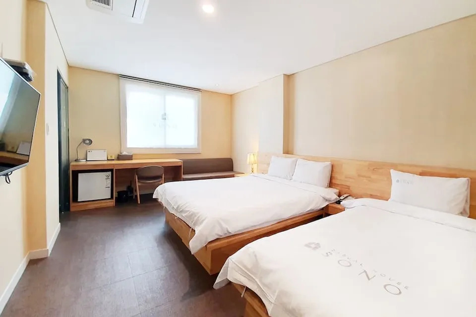 提供四人房,5 岁以下儿童免费入住,浴室带独立浴缸,含免费韩式早餐。