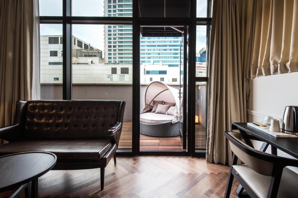 客房宽敞,带小型客厅,浴室配备按摩浴缸和 LG 蒸汽电子衣橱。