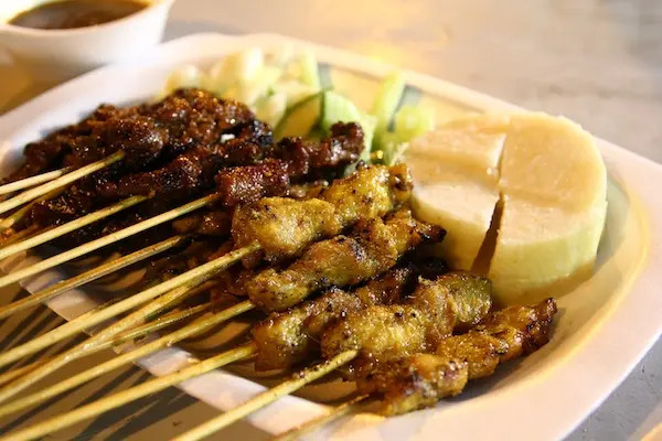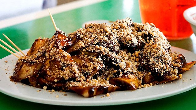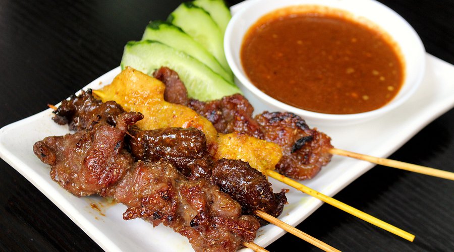 沙嗲是马来西亚的著名传统美食,将腌制好的鸡肉、牛羊肉串成肉串,放在炭火上烤,烤制途中再抹上一层特制的香茅油能为肉串增添独特的香味。烤好的肉串,蘸上甜中带辣的沙嗲酱一起食用,也可以搭配马来粽子、黄瓜和圆葱。沙嗲酱是由花生酱、椰酱和幼虾等调制而成。
