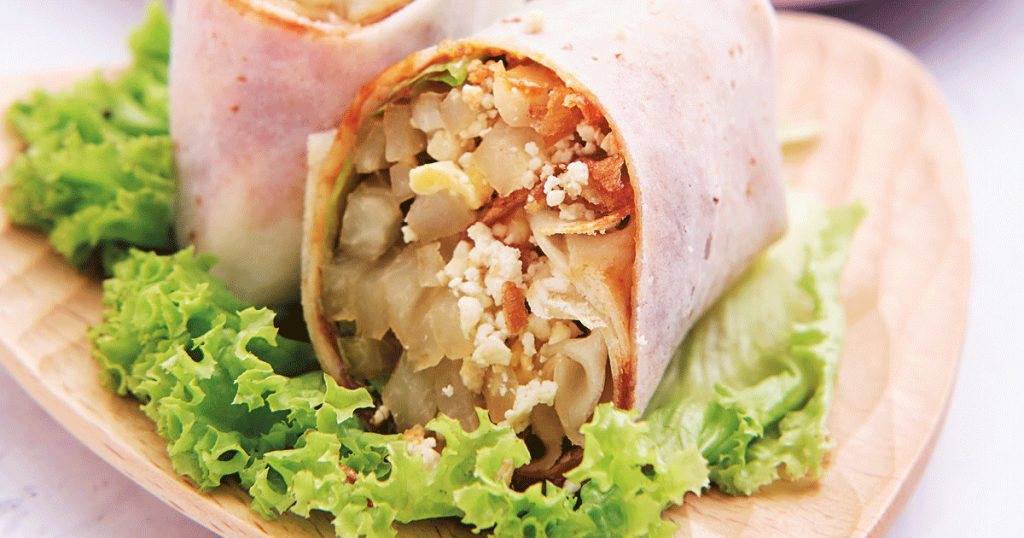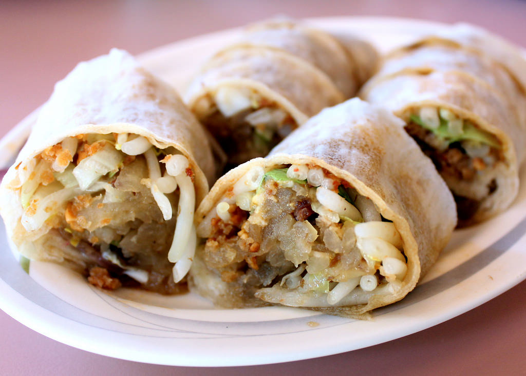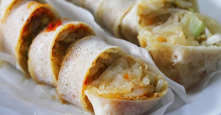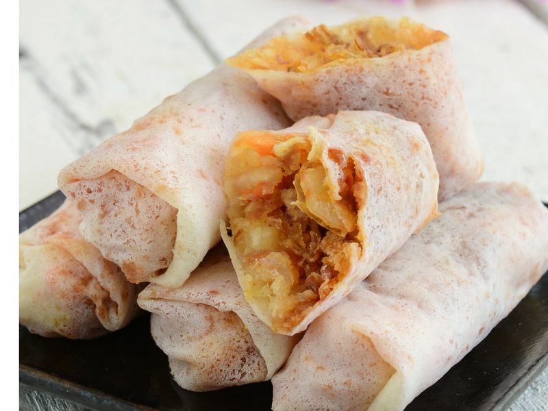Popiah 是马来西亚著名的传统小吃,同时也是印尼棉兰(Medan)和新加坡的著名传统小吃。薄饼的做法就是把各种食材依次摆放在一张又薄又软的饼皮上,再抹上一层特制的酱料(分别有甜酱和辣酱),最后将其卷起来就完成了。薄饼的馅料丰富多样化,基本食材有:沙葛丝、豆芽、红萝卜丝、豆干丝、笋丝、鸡蛋丝、虾等,除了这几种基本食材,也可以加入一些虾米、花生碎吃起来味道更香,口感也更有层次感。