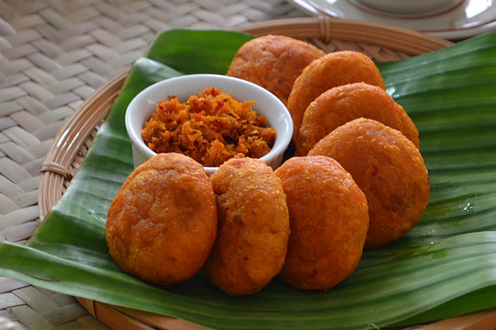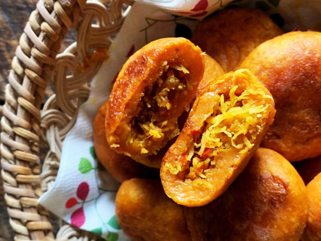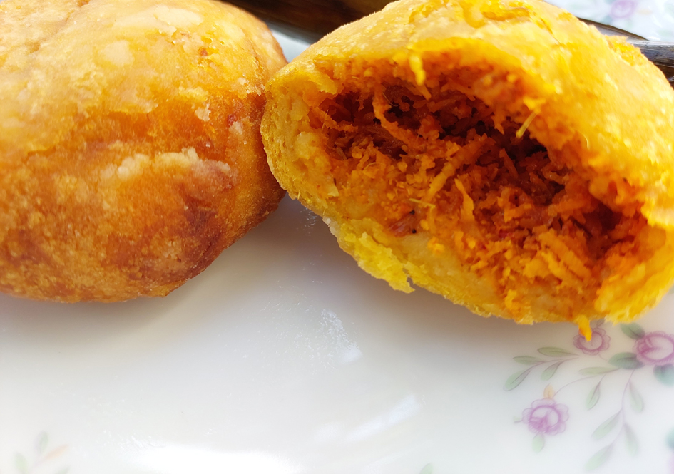 Cucur badak是传统马来糕点,一般作为早餐或下午茶的点心。这款“油炸圈饼”是以地瓜制作而成,它的主要馅料——椰丝,将新鲜的椰丝和特制辣酱、香茅、黄姜、葱和蒜一起炒熟后,把炒熟的香辣椰丝包入揉成饼状的面团里,下锅油炸之呈金黄色即可出锅。