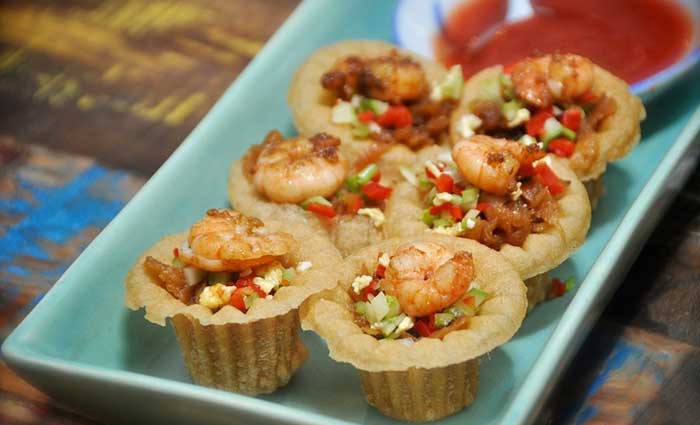 Pie Tee 是娘惹的代表小吃之一,由于其特殊的外形,它也被称为“大礼帽”。Pie Tee 是一个又薄又脆的杯状小吃,装在杯状的外壳里的馅料是各种食材,如:竹笋、土豆丝、萝卜和虾仁等,最后在上面淋上特制的辣酱汁就可以吃了。