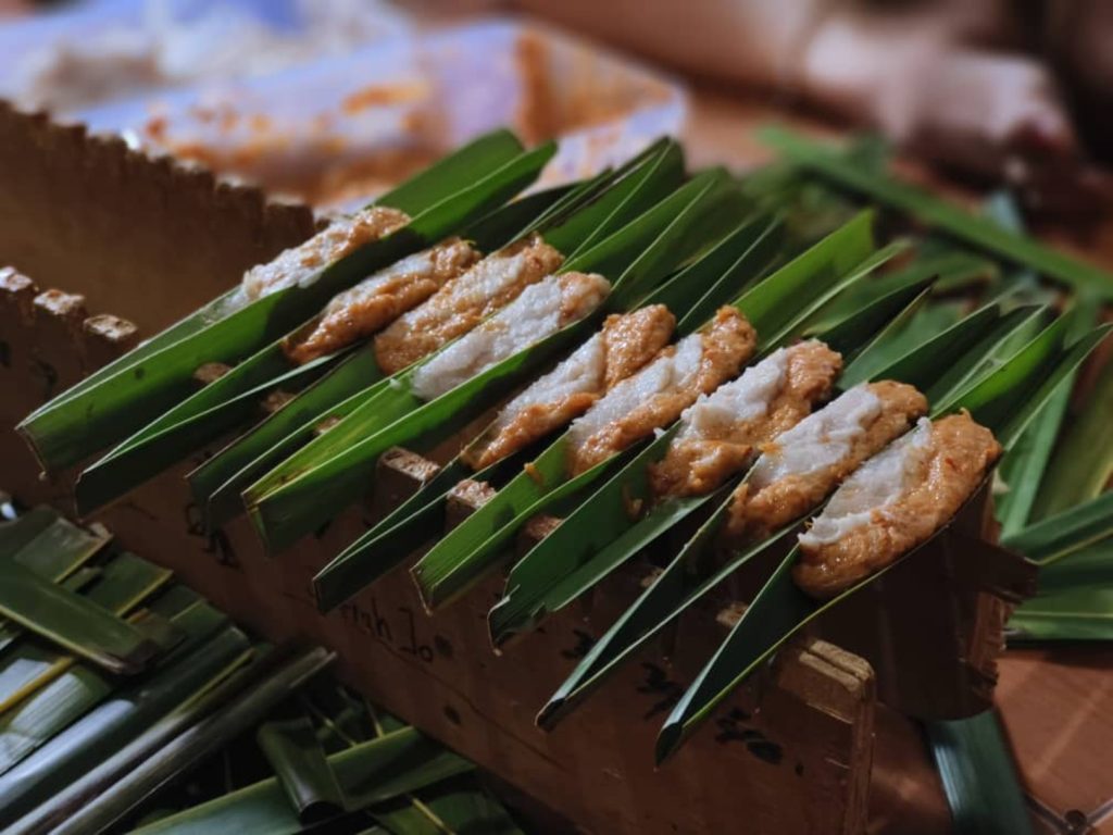 麻坡最著名的美食代表——Otak-otak是以新鲜的马鲛鱼为主料,再配以十几种调味料,如:香茅、辣椒、姜、蒜、椰奶、胡椒等,并将鱼肉泥用“Atap叶” 裹起来,然后放在炭火上烤,烤至香味出来后就完成了。