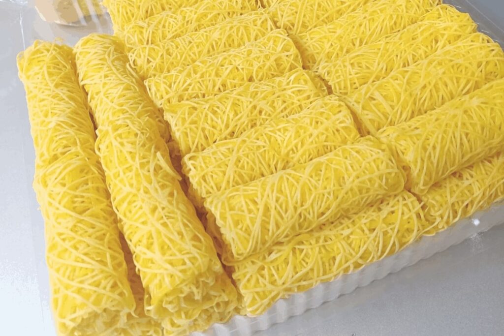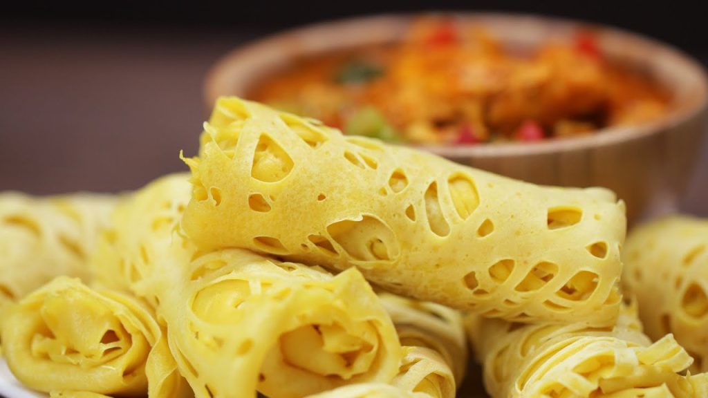 Roti Jala 是一道传统马来美食,是马来人在开斋节或节庆时用来招待客人的一道小吃。Roti Jala的做法简单,把面糊装进网状的容器里,然后把面糊铺在铁板上做出一张像蜂巢的大网,烤好后趁热卷成筒状或者折成三角形。这道饼的质地柔软,表面微脆,因为加入了姜黄粉,所以呈现出的颜色也是金灿灿的,非常有南洋风范。
