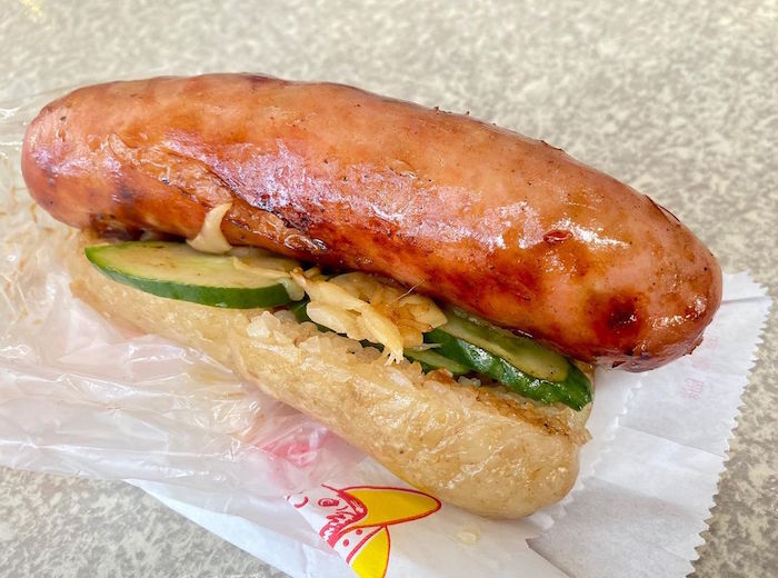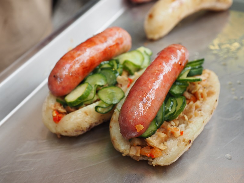 台湾各地夜市常见,如台中逢甲夜市、台南花园夜市等。炭火烧烤的大肠外皮微酥,肉馅米粒饱满,夹上风味绝佳的香肠,再铺上酸菜、小黄瓜、姜片与菜脯蛋等小菜,一口咬下肉汁四溢。