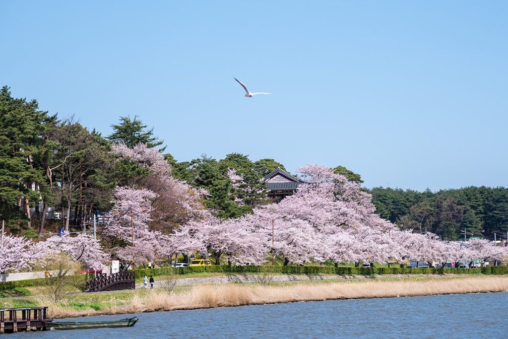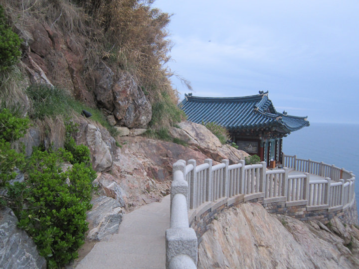 洛山寺内遍植樱花树,千年老松挺立,亭台听涛拍浪,蔚蓝无际的日本海(韩国称东海)竟一点不输其他以美景出名的海域,被誉为朝鲜半岛“关东八景”之一。