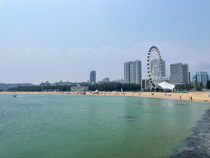 接着走便来到束草的主海滩,就在高速巴士车站对面。显眼包“人大”logo其实取自韩语束草“속초”每个字的上半部,却意外成就了中国游客喜闻乐见的打卡点。